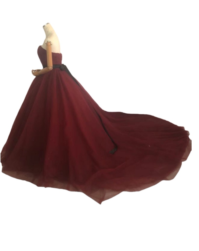 最先端上品!カラードレス ボルドー色 ベアトップ サッシュベルト チュールドレス クラシカル公式店舗